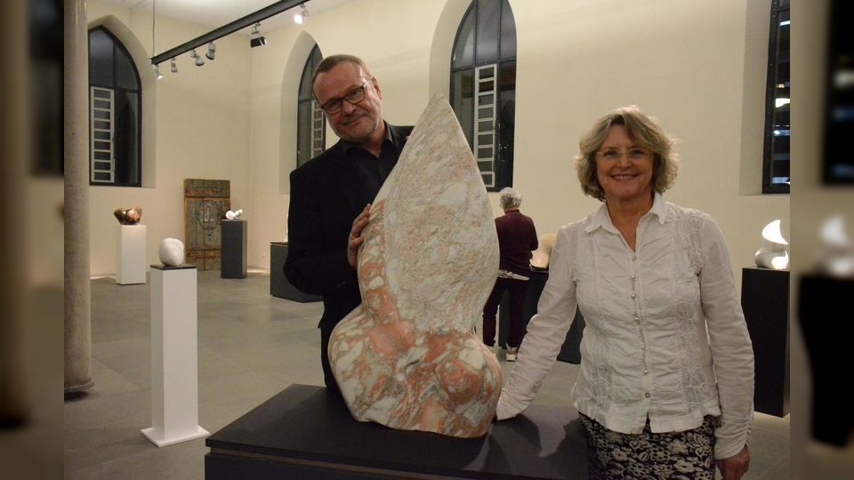 Das Berühren der Steinskulpturen ist in der Ausstellung von Angelika Schneider (rechts), hier zusammen mit Laudator Hermann Dippon, erlaubt.
